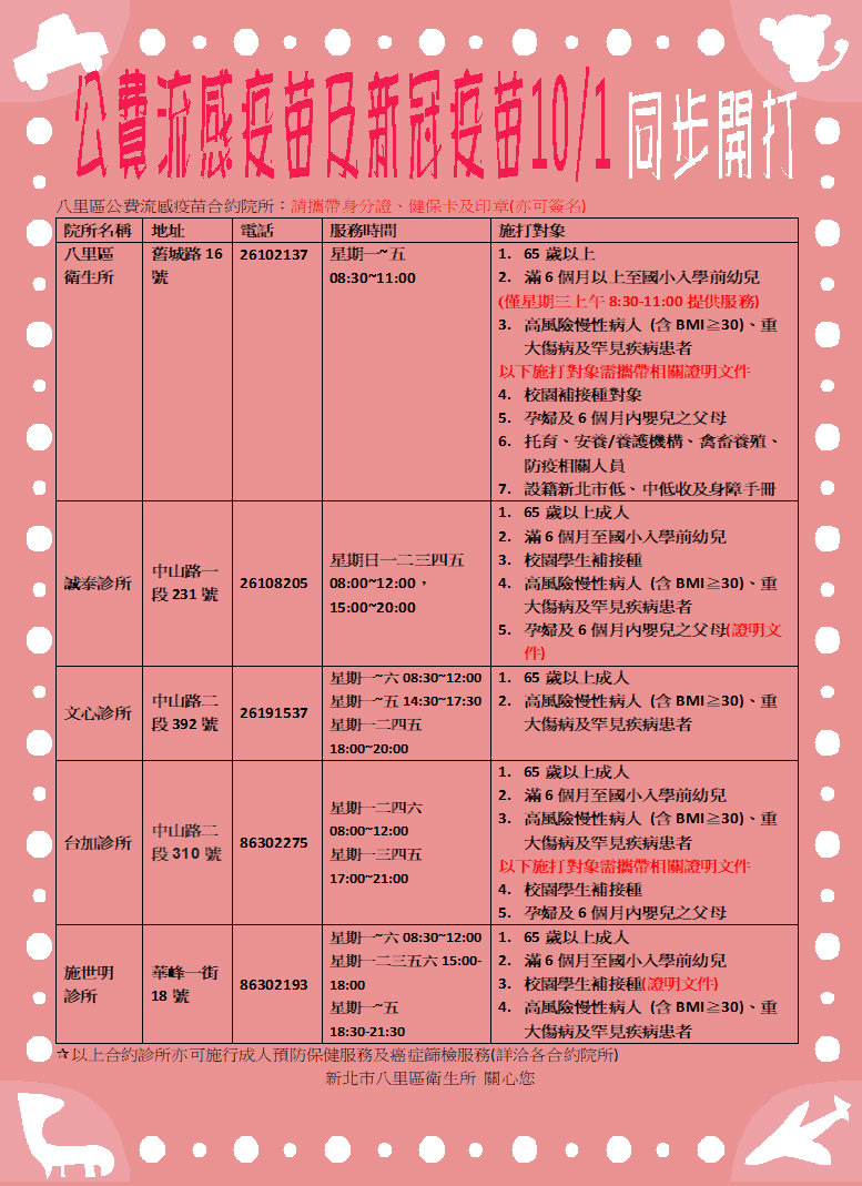 【八里區衛生所】公費流感疫苗及新冠疫苗同步開打-合約院所資訊