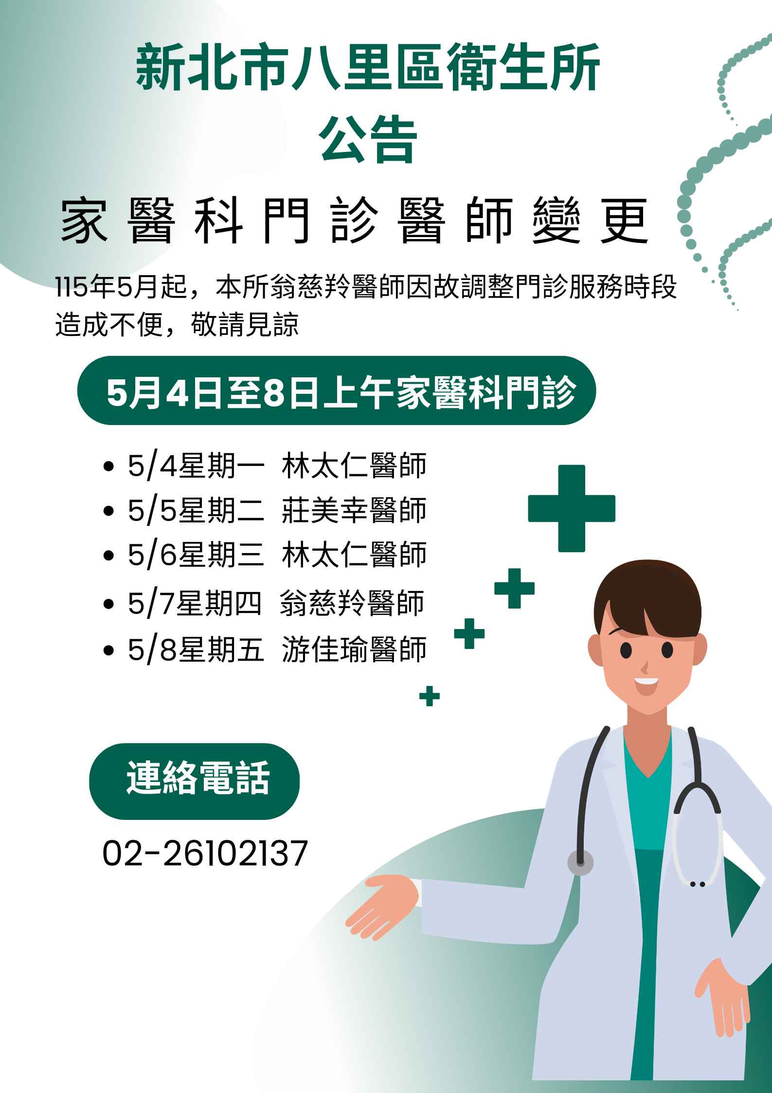 【八里區衛生所】家醫科醫師變更公告