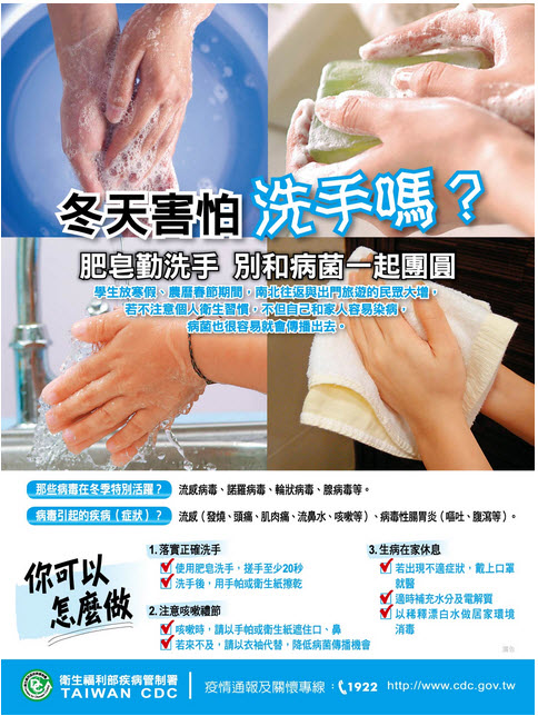 肥皂勤洗手,別和病菌一起團圓。學生放寒假,農曆春節期間,南北往訪與出門旅遊的民眾大增,若不注意個人衛生習慣,不但自己和家人容易染病,病毒也很容易就會傳播出去。那些病毒在冬天特別活躍?流感病毒、諾羅病毒、輪狀病毒、腺病毒等。病毒引起的疾病(病症)流感?流感(發燒、頭痛、肌肉痛、流鼻水、咳嗽等)、病毒性腸胃炎(嘔吐、腹瀉等)。你可以怎麼做 1.落實正確洗手-使用肥皂洗手,搓手至少20秒-洗手後,用手帕或衛生紙擦乾2.注意咳嗽禮節-咳嗽時,請以手帕或衛生紙周這口、鼻-若來不及,請以衣袖代替,降低病毒傳播機會。3.生並在家休息-若出現不適病症,戴上口罩就醫-適時補充水分及電解質-以稀釋漂白水做居家環境消毒